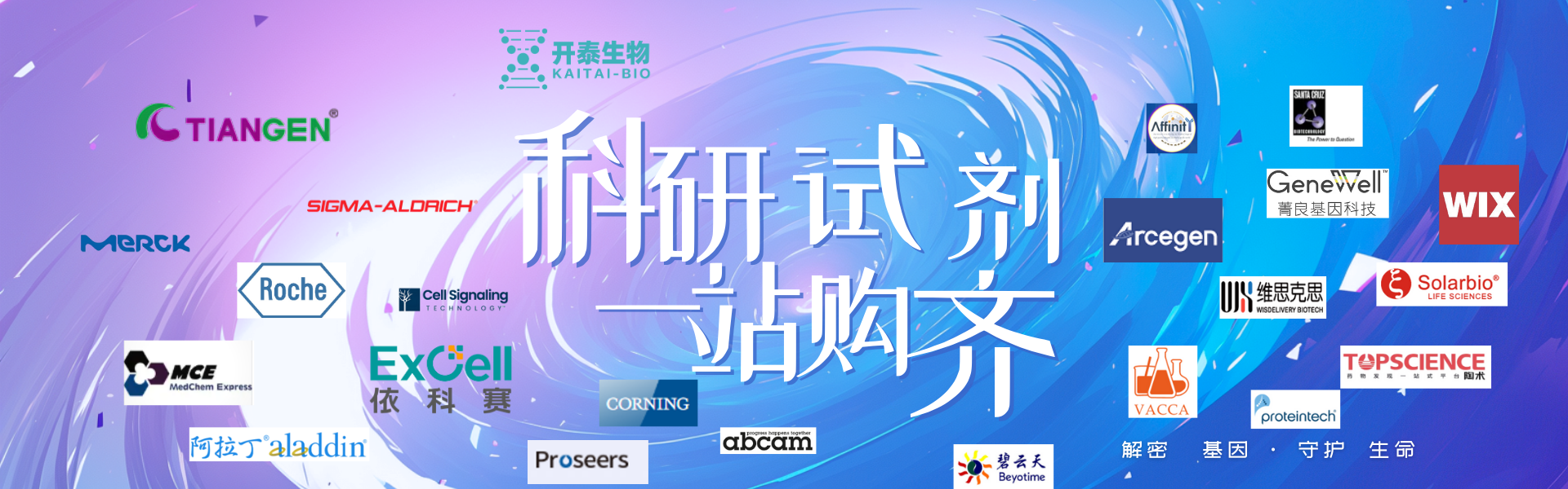 开泰代理天根(Tiangen)、海尔(Haier)、Roche、Sigma、Merck、依科赛血清、KAPA、阿拉丁、CST、Abcam、亲科(Affinity)抗体、普洛斯纯水仪、韦克斯电泳仪、Elisa试剂盒,维思克思外泌体试剂盒等多家世界五百强企业或特色企业产品。
