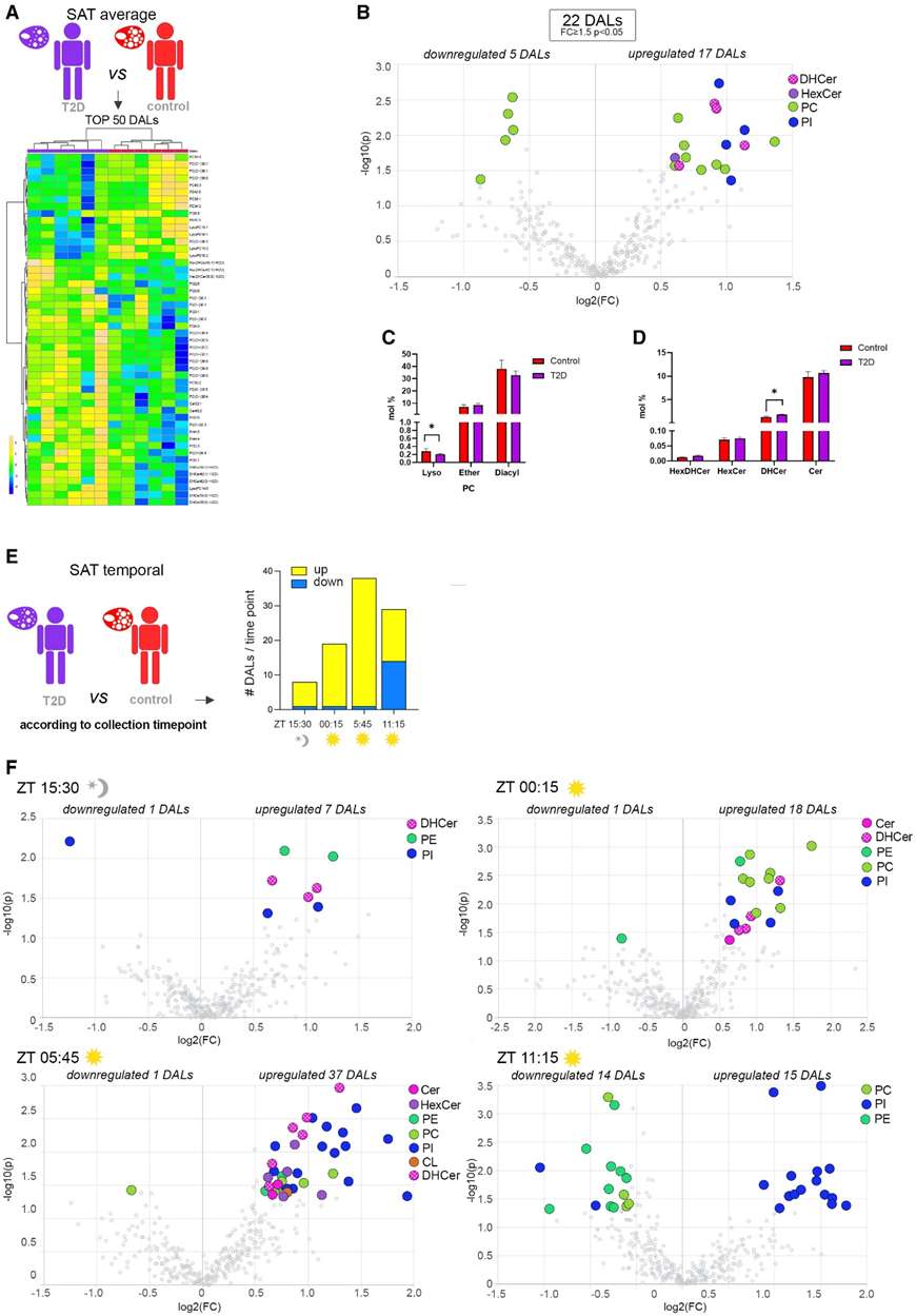 (A) 对 2 型糖尿病和对照受试者之间最具对比模式的前 50 名 SAT 脂质进行层次聚类分析。(B) T2D 和对照 SAT 之间的 DAL 火山图。(C) T2D 和对照 SAT 中的相对 PC 水平(mol%)。(D) T2D 和对照 SAT 中 DHCer、Cer、HexDHCer 和 HexCer 的相对水平(mol%)。(E) 四个时间点 T2D 和对照之间 SAT DAL 的分析。(F) 在指定时间点 T2D 和对照 SAT 之间的 DAL 火山图。