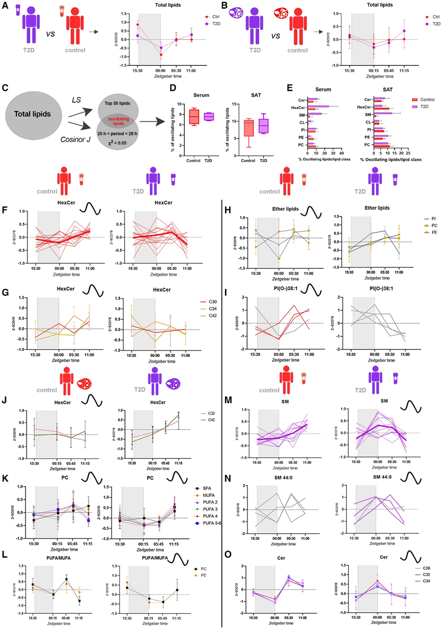 (A-B) 对照和 T2D 个体血清和 SAT中总脂质的平均时间水平(Average temporal levels)。(C) 节律分析工作流程的示意图。(D) 对照组和 T2D 组的血清(左)和 SAT(右)中波动脂质的平均百分比。(E) 对照和 T2D 受试者中血清(左)和 SAT(右)脂质的节律性脂质/脂质类别百分比的表示。(F) 血清中测量的 HexCers 的时间水平。(G-H) 在对照血清中测量的三种 HexCers和乙醚 PI、PC 和 PE的平均时间水平。(I) 醚脂质时间谱的代表性实例:PI(O-)38:1 在三种对照血清中鉴定为有节律。(J) SAT 中测量的两种节律性 HexCer 脂质的平均时间水平。(K)对照个体在SAT中测量的pc的平均时间分布,并按不饱和程度分类,从SFA到PUFA脂质。MUFA和PUFA-3谱确定为每日节律。(L) PC和PE PUFA/MUFA比值的平均时间分布,其中PC和PE都确定为SAT的日常节律。(M) T2D血清中所有SM的时间水平。(N) SM 时间谱的代表性示例:SM44:0 在三种 T2D 血清中合格的节律性。(O) 按链长度聚类并在 T2D 血清中检测的三个节律性 Cers 的平均时间分布。