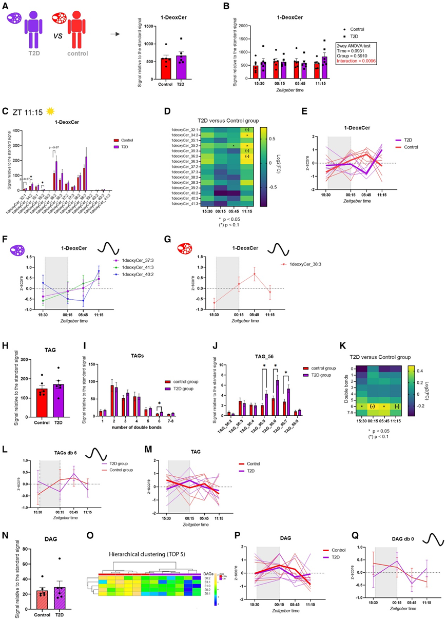 (A) 从 T2D 和对照供体收集的 SAT 中 DeoxCer 水平的 LC-MS 信号。(B) T2D 和对照供体在四个连续时间点的 DeoxCer 水平的时间比较。(C) 在 ZT11:15 从 T2D 和对照受试者测量的 DeoxCer LC-MS 信号,显示 T2D 中具有短链长度的 DeoxCer 显著丰度。(D) DeoxCer log2 转换的热图,在每个时间点对照与 T2D 之间的差异倍数。(E) 每个受试者(T2D,对照)的总 DeoxCer 的时间水平。(F-G) 在对照和 T2D (G) 中合格的 DeoxCers 的平均时间分布。(H) T2D 和控制 SAT 中 TAG 水平的 LC-MS 信号。(I) 按双键数量排序并在 T2D 和对照 SAT 中测量的各个 TAG 的 LC-MS 信号。(J) TAG:56 物种的 LC-MS 信号,按双键数量排序,并在 T2D 和对照受试者中测量。(K) 按双键数量排序的 TAG 热图,每个时间点对照个体与 T2D 个体之间的 log2 转换差异倍数。(L) T2D 和对照中带有六个双键的 TAG 脂质的平均时间分布。(M) 每个受试者的时间总 TAG 水平。(N) T2D 和对照中 DAG 水平的 LC-MS 信号。(O) 对 T2D 和对照受试者之间最具对比模式的前 5 个 DAG 进行层次聚类分析。(P) 每个受试者的时间总 DAG 水平。(Q) T2D 和对照中具有 0 个双键的 DAG 的平均时间分布。