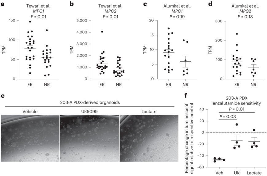 (a- d) MPC1或MPC2 的 mRNA 丰度。 (e-f) 用载体、10 μM UK5099 或 20 mM 乳酸钠处理 7 天的 MDA PCa 203-A PDX 衍生类器官的代表性相差图像和量化。