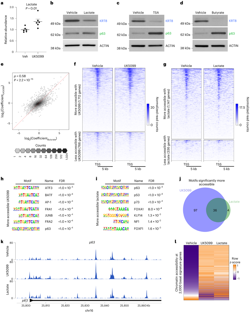 (a) 用载体或 10 μM UK5099 处理 7 天的原代基底源性小鼠类器官中的细胞外乳酸丰度。 (b-d)免疫印迹分析。 (e) 每个基因的 UK5099 的log 2系数与丁酸盐效应之间的 Spearman 相关性。 (f-g) 小鼠类器官中高可及性基因和低可及性基因的热图。(h-i) 可及性区域中七个最显著富集的转录因子结合基序。(j) 维恩图显示在 UK5099 处理和补充乳酸的类器官中可及的区域中显著富集的转录因子结合基序的重叠。(k) ATAC-seq 峰分析。 (l) 染色质可及性热图。