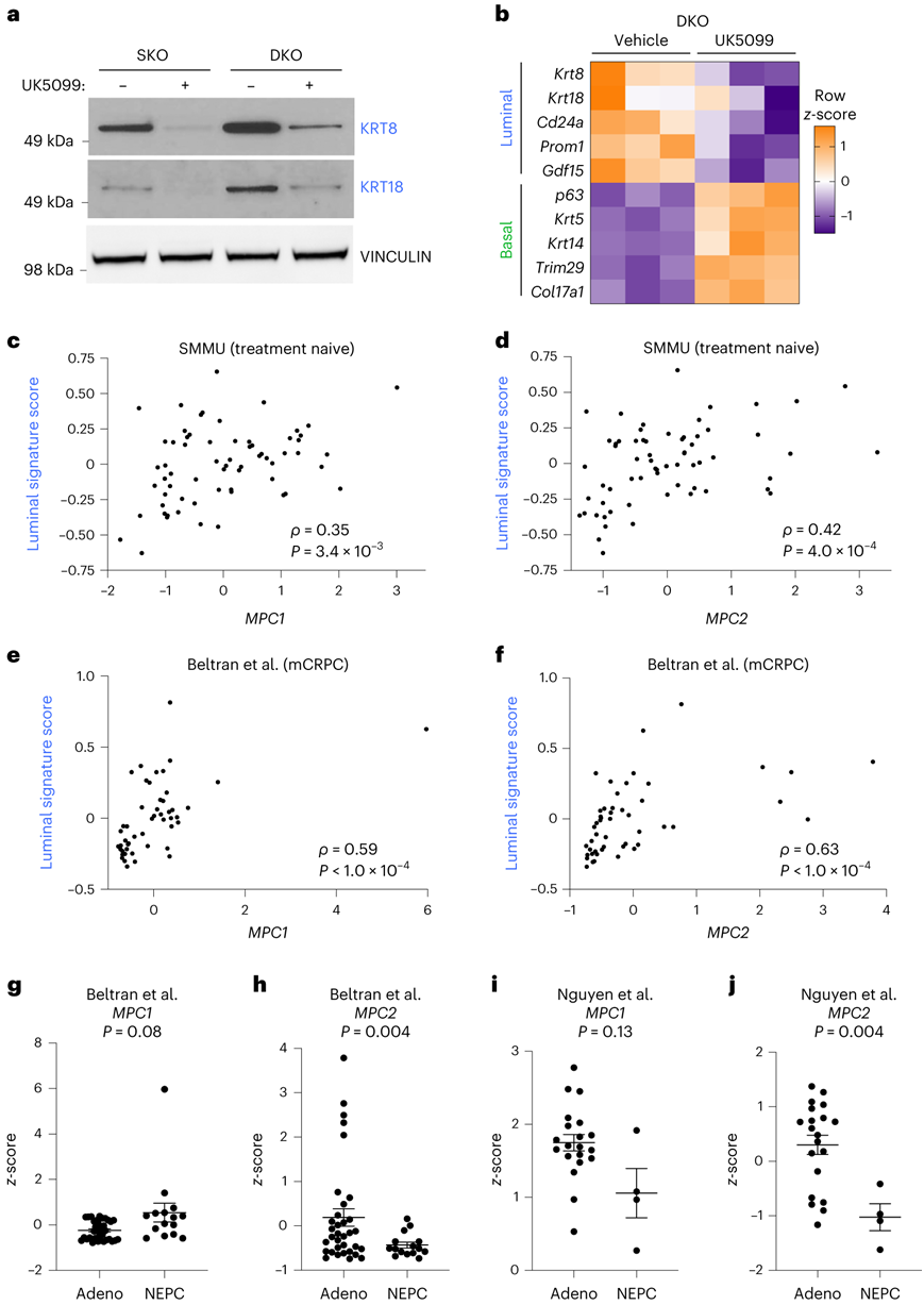 (a)免疫印迹分析。(b) 来自载体和 10 μM UK5099 处理的 DKO 类器官的 RNA-seq 的典型基底和管腔标记的热图。(c-d) 来自 SMMU 数据集的未接受治疗的前列腺癌样本中管腔特征评分与MPC1或MPC2 z评分的相关性分析。 (e-f) 转移性去势抵抗性前列腺癌样本中管腔特征评分与MPC1或MPC2 z评分的相关性分析。 (g-h) 腺癌 (adeno) 或神经内分泌前列腺癌 (NEPC) 样本中MPC1或MPC2的 RNA 丰度。 (i-j) MPC1和MPC的 RNA 丰度。