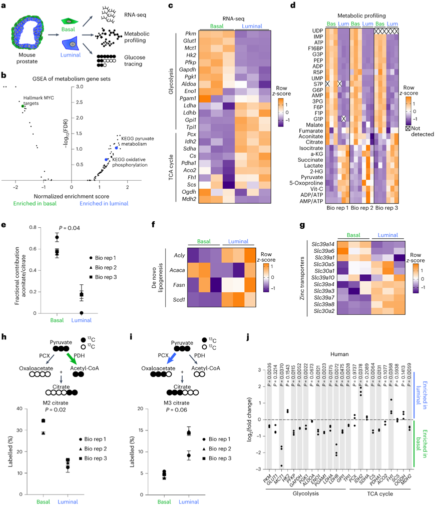 (a) 对从小鼠前列腺分离的原代基底细胞和管腔细胞进行的RNA-seq、代谢组学分析和葡萄糖追踪的示意图。 (b) 基底细胞和管腔细胞中所有 KEGG、Hallmark 和 Reactome 代谢基因集的 GSEA。 (c) 来自基底细胞和管腔细胞的糖酵解和TCA循环酶的热图。(d) 原代基底细胞和管腔细胞中代谢物丰度的热图。(e) 用[U- 13C]葡萄糖示踪剂喂养16小时的原代基底和管腔细胞中乌头酸盐与柠檬酸盐的分数贡献比。(f-g) 来自原代基底细胞和管腔小鼠前列腺细胞的 RNA-seq 的涉及从头脂肪生成和锌转运的基因热图。 (h-i) 基底细胞和管腔细胞中[U- 13C] 葡萄糖的M2 柠檬酸百分比和 M3 柠檬酸百分比。(j) 来自三个人类前列腺的基底细胞和管腔细胞的RNA-seq的糖酵解和TCA循环酶的差异倍数。
