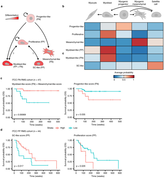 a RMS中微分轨迹的示意图。b热图显示RMS分子亚型(y轴)和正常肌源性细胞类型的离散恶性细胞状态之间的平均预测相似性(概率)。c,d Kaplan-Meier图显示了(c)FN(n=47)或(d)FP(n=44)患者的总体生存概率。