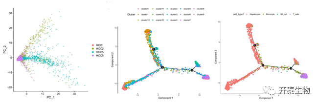 (图2:主成分分析显示不同患者之间差异;拟时序分析按细胞簇分组;拟时序分析按亚型分组)