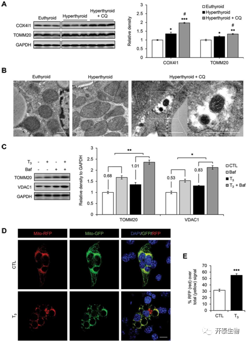 接着,因为作者此前研究发现T3能在骨骼肌和肝脏中诱导线粒体自噬,由于棕色脂肪组织(BAT)同样含有大量线粒体,于是便通过类比推测T3在BAT中同样能诱导线粒体自噬以维持线粒体的动态平衡,为了验证这一设想,作者利用自噬专一性抑制剂Chloroquine (CQ)处理甲亢小鼠BAT后,检测线粒体标志蛋白COX411以及TOMM20蛋白表达水平发现(图2 A),与未处理的甲亢小鼠相比,CQ处理组的这两个蛋白表达水平增加,也就是说T3促进线粒体自噬的效果被CQ抑制,联合其他实验结果(图2 B-E),说明T3确实能促进线粒体自噬。