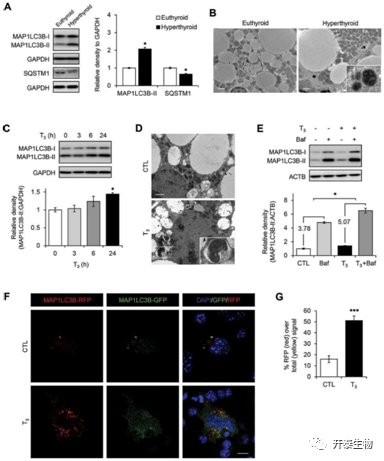 首先,作者作出初步假设,T3能促进小鼠脂肪组织产生自噬,并通过检测甲亢小鼠棕色脂肪组织中自噬发生的标志性蛋白SQSTM1/p62以及MAP1LC3B-II的表达水平(图1 A),以及自噬小泡数量的增加来说明T3确实促进了自噬的发生(图1 B),并且这种促进作用与T3作用时间和剂量呈依赖关系(图1 C),为了增强说服力,排除事件发生的或然性,作者进一步结合体外实验,利用T3处理小鼠原代棕色脂肪细胞后检测自噬小泡数量以及自噬流,发现T3在体外试验中同样能促进自噬的产生(图1 D-G)。