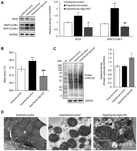 那么自噬对于甲亢小鼠机体产热的影响是什么呢?又是如何影响的呢?将甲亢小鼠BAT的Atg5特异性敲除后,发现与对照组相比,敲除组的体温相对降低(图6 B),且BAT特异性敲除Atg5 的甲亢小鼠中羰基蛋白质和变形线粒体的含量增加(图6 C-D)。实验结果表明,T3诱导自噬,促进线粒体周转保护其免受氧化应激。