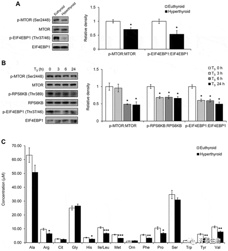 作者随机进一步展开T3与自噬的机制研究,由于MTOR信号通路是一条经典的自噬相关通路,并且前人研究表明T3与MTOR信号通路有关,作者首先检测了甲亢小鼠BAT以及棕色脂肪细胞中MTOR相关蛋白的表达水平,结果发现,甲亢小鼠BAT和棕色脂肪细胞中磷酸化的MTOR 、EIF4EBP1、RPS6KB含量减少,且BAT中多种氨基酸的含量减少(图7)。