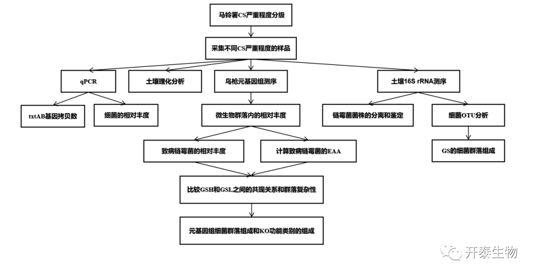 本研究旨在探讨土壤微生物群与CS之间的相互作用,并证实GS的微生物群落组成和功能与CS严重程度相关。低txtAB基因丰度、低细菌丰度、高细菌多样性、高共现网络复杂性和高群落功能相似性是马铃薯CS严重程度低的指标。
