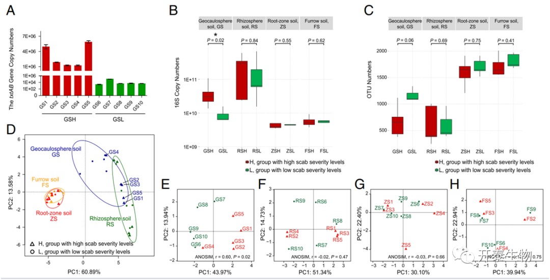 所有土壤样本的进行16S rRNA测序,进行OTU分析。从细菌群落中共产生了2700个OTU,GSH中的OTU数量低于GSL(图1c)。GS的细菌OTU数与疮痂严重程度呈显著负相关。