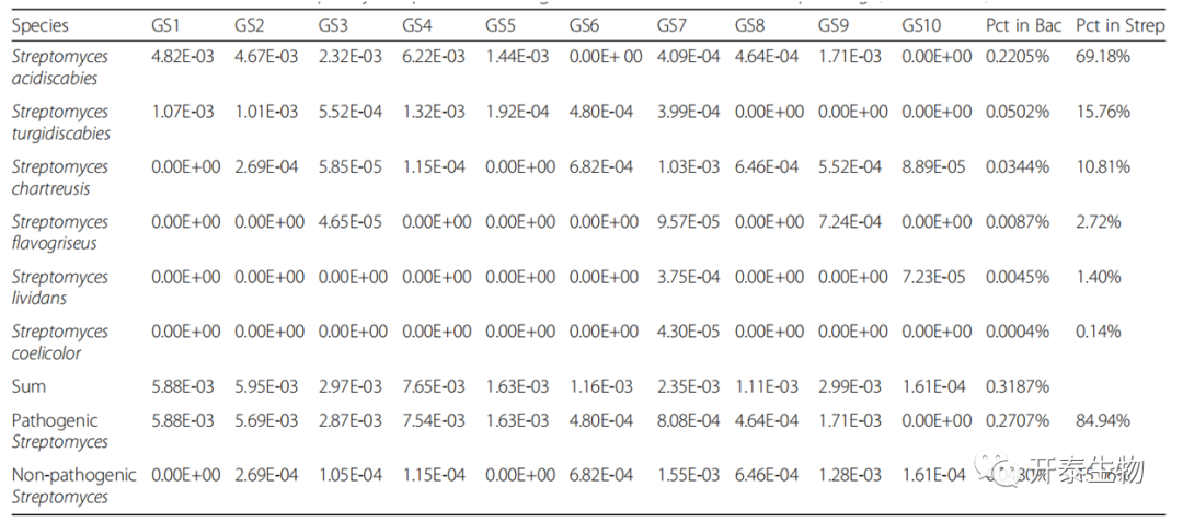 通过MetaPhlAn v.2.0软件量化微生物群落内的相对丰度。微生物群落的主要组成部分细菌被分离出来,S. acidiscabies 和S. turgidiscabies是可能的CS病原体(表2)。其中S. acidiscabies是样品中MetaPhlAn2分析的主要CS病菌,与NR排列结果一致。
