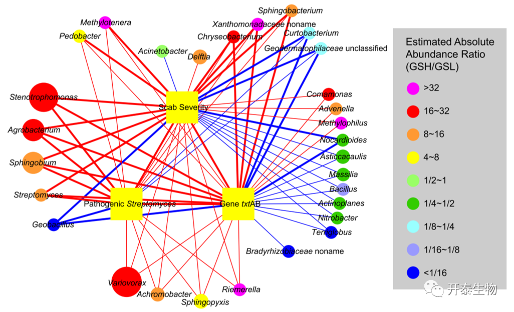 图2 元基因组细菌的EAA(属级)与疮痂严重程度、致病链霉菌的EAA和txtAB基因拷贝数之间的相互作用网络。