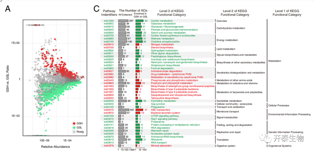 在GSH和GSL中分别发现了240和561个显著富集的KO功能类别(图4a)。保留了98个相对丰度大于0.03%的差异性KO功能类别(图4b),其中16个显著富集GSH,82个显著富集于GSL。在GSH和GSL中,"新陈代谢 "途径是主要的组成部分,但在GSL中有多条途径属于 "遗传信息处理",而在GSH中没有这样的途径。