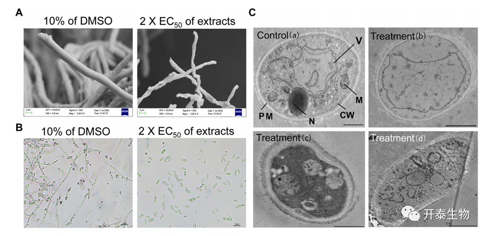 用透射电镜观察Foc TR4菌丝细胞的超微结构。在对照组中,细胞壁、细胞膜和细胞器完整且清晰。可以清楚地观察到小泡、液泡、脂质体和线粒体等器官(图2C)。