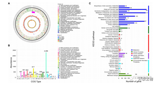 (A)菌株 JBS5-6染色体圆形图谱,从外到内,第1、4环:正/反链上按COG类别着色的蛋白质编码基因 第2、3环:正/反链上的CDS、tRNA和rRNA 第5环:G + C的含量 (B)JBS5-6菌株基因组的COG注释(C) 根据KEGG数据库对JBS5-6菌株基因组的路径注释