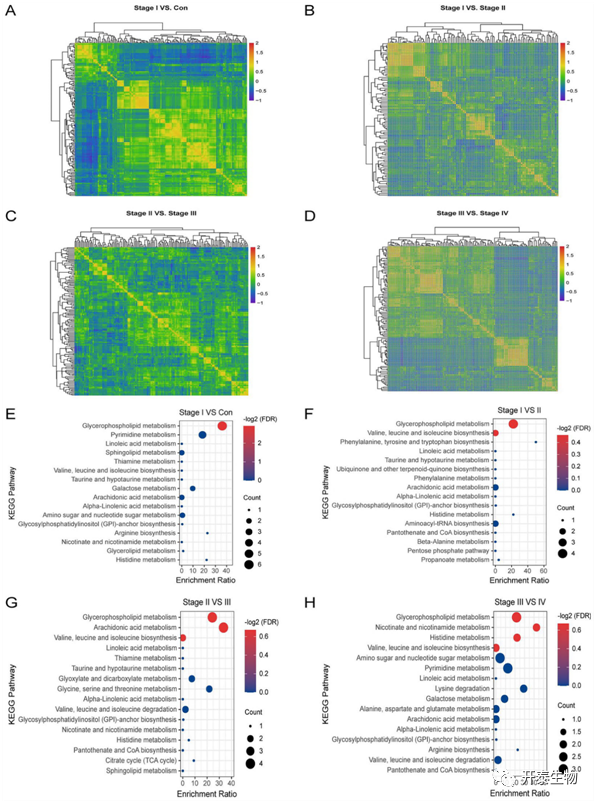 应用Pearson相关系数分析比较了每对样本(I期与对照组、I期与II期、II期与III期、III期与IV期)之间的代谢物相关性。Pearson相关系数P<0.1的代谢物被确定为显著相关(图2A-D)。为了进一步验证代谢途径,从KEGG数据库中检索了上述所有存在明显差异的代谢物,结果显示甘油磷脂代谢途径是显著不同的代谢途径(图2E-H)。
