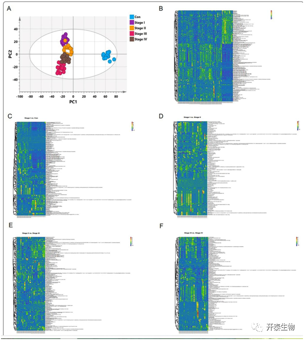 A OPLS-DA分数图,代谢物表达热图。B ESCC各分期vs.对照(Con),C I期vs.con,D I期vs. II期,E II期vs. III期,F III期vs. IV期