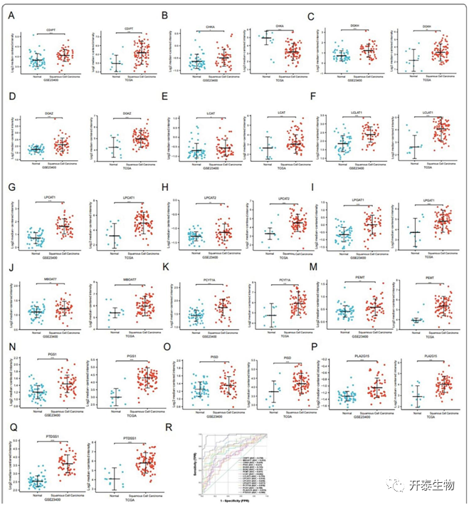 77个甘油磷脂代谢基因中的16个基因在GSE23400和TCGA数据集中显著差异表达。A CDIPT, B CHKA, C DGKH, D DGKZ, E LCAT, F LCLAT1, G LPCAT1, H LPCAT2, I LPGAT1, J MBOAT7, K PCYT1A, M PEMT, N PGS1, O PISD, P PLA2G15, Q PTDSS1。R 16个甘油磷脂代谢的基因ROC分析