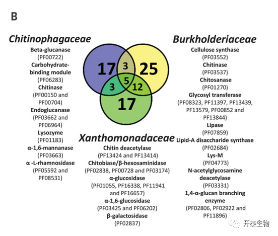 (B)三种内生菌的不同CAZymes注释的维恩图