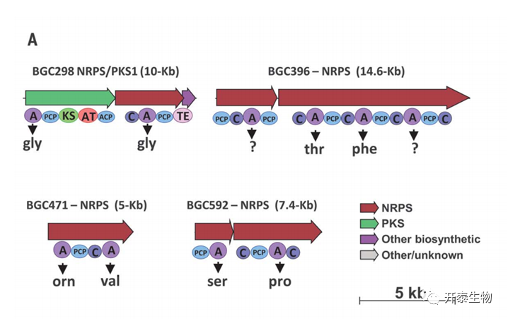 筛选的1935个内生菌菌株通过16S rRNA测序进行了分类,有8个不同的属,主要为Bacteroidetes、Gammaproteobacteria。尽管通过PCR筛选没有发现与Chitinophaga或Pseudomonas相关的BGCs,但在从S+R条件下获得的Flavobacterium菌株中发现了4个BGCs(BGC298、BGC396、BGC471和BGC592)。其中三个编码NRPS(BGC396、BGC471和BGC592),第四个是NRPS-聚酮酸合成酶(PKS)混合基因簇(BGC298,图4A)。类似的方法证实了从S+R条件下获得的三个内生的Chitinophaga菌株中存在糖基水解酶(GH18)基因(图2A)。