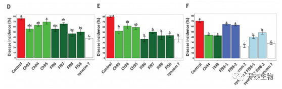 生物测定表明,与单个菌株相比,Chitinophaga和Flavobacterium联合体对真菌根部感染具有显著且更稳定的保护作用(图4,D至F)。