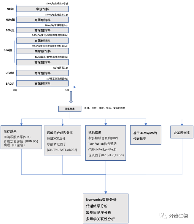 随着人们生活方式的改变,高尿酸血症群体逐渐扩大,传统的高尿酸血症治疗方式通常伴随着或多或少的副作用,低嘌呤饮食也并不能从根本上解决高尿酸血症,因此寻找一种可靠的、安全的、天然的降低高尿酸血症的方法显得尤为迫切。高尿酸血症发病机制较为复杂,但总结起来即尿酸产生过多而排泄过少。既往研究表明,除了肾脏,肠道也在尿酸代谢中扮演着重要的角色,肠道功能的紊乱、肠道菌群的失调都将导致尿酸代谢降低、肾脏炎症升高,最终导致机体指标异常。目前,中药因其成分天然等原因逐渐获得重视,如黄芪广泛用于改善肾脏、肠道、肝脏功能,但中药有效分子通常较大,生物利用度低,因此在本文中,作者使用可用于人体的益生菌——枯草芽孢杆菌对黄芪进行微生物转化,并用多组学联合的方式探究枯草芽孢杆菌发酵黄芪(BFA)是否通过影响肠道菌群及代谢物改善高尿酸血症。