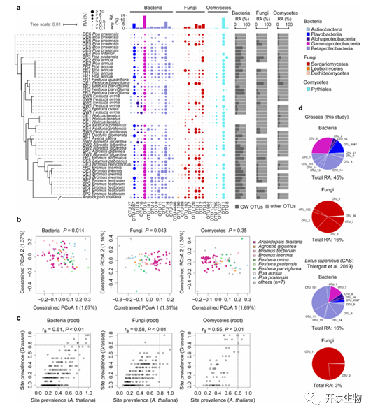 (a)草种的多样性和根系中地理上广泛存在的OTU (b)根中细菌、真菌和卵菌群落的物种限制 (c)拟南芥根中OTU的流行率和共生草根中OTU的流行率之间的Spearman等级相关性 (d)共生草和莲藕根中地理分布广泛的OTU