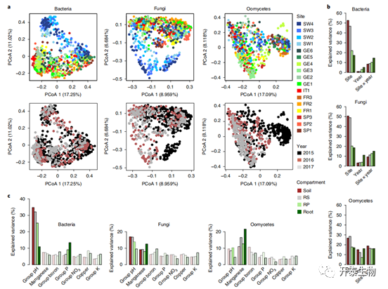 (a)在17个地点、4个区间和连续3年收获的样本基于Bray-Curtis距离的PCoA(b) 地点、采收年对细菌、真菌和卵菌群落组成的影响(c)在每个地点的环境变量对细菌、真菌和卵菌群落组成的影响