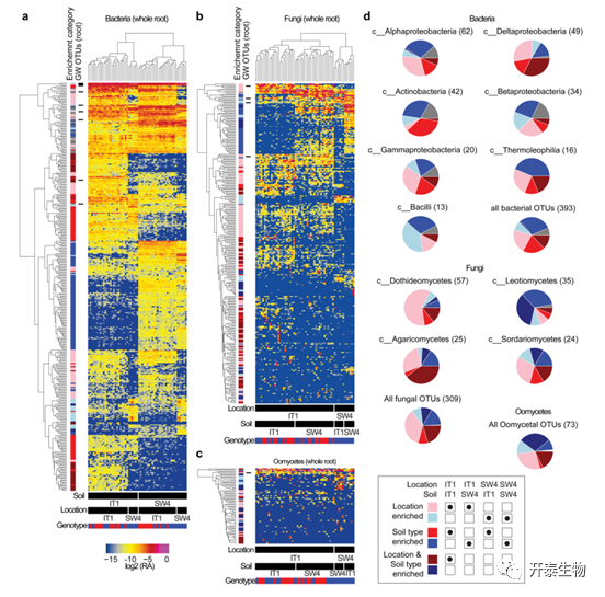 计算拟南芥根中的微生物OTU在17个地点的流行率。在地理上广泛分布的细菌OTU,在根平面和根际中更为丰富(图4b)。其中有13个细菌OTU在拟南芥根系一致检测到(图4a,c) ,占该分区总 RA的38% (图4d)。