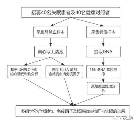 在临床失眠患者的粪便中,已发现了较正常人改变的肠道微生物群,除了肠道微生物群的组成外,失眠症患者的信号通路和代谢功能也受到干扰。已有研究发现失眠患者的炎性细胞因子增加,肠道菌群组成也有改变。还有研究表明,睡眠不足或减少会导致外周代谢发生变化。然而,几乎没有研究使用综合方法来探索肠道菌群、血清代谢物和炎症细胞因子在失眠症中的相互关系。在本研究中,作者分析了失眠患者的肠道微生物群、血清代谢物和炎症细胞因子,并将它们与具有良好睡眠史的对照参与者进行了比较。本研究通过16S rRNA测序、炎症因子的酶联免疫吸附测定(ELISA)和非靶向代谢组学,揭示了代谢、免疫和肠道微生物群之间的联系。