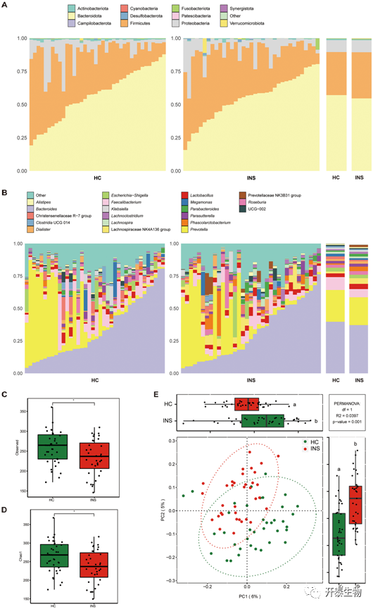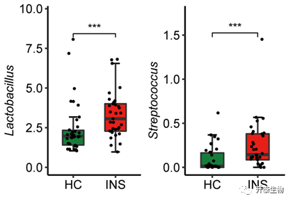 对于alpha 多样性(图1C和D),在Chao1 指数和扩增子序列变异 (ASV)上,健康对照组 (HC)明显高于失眠组 (INS)。主坐标分析(PCoA)可用于比较两组之间的细菌群落模式差异。结果(图1E)表明,失眠组和健康对照组之间的社区模式存在显著差异。