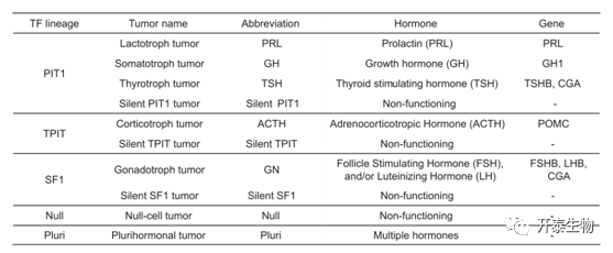 垂体神经内分泌肿瘤(PitNET)是最常见的颅内肿瘤之一,超过40%的PitNET在手术时具有侵袭性。世界卫生组织(WHO)在2017年的分类中,根据转录因子(TF)标志和激素表达的免疫组化结果将垂体瘤分为10个亚型(如下图)。然而,使用该分类系统选择治疗策略的指导十分有限。因此,需要进行更多的研究来改进当前的临床病理分类系统,并且积极探索垂体瘤的高级治疗策略,比如靶向治疗和免疫治疗。