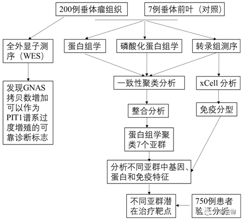 在本研究中,作者对200名PitNET患者进行了最大规模的整合基因组学、转录组学、蛋白质组学和磷酸蛋白质组学分析。GWAS数据表明,GNAS拷贝数增加可以作为PIT1谱系过度增殖的可靠诊断标志。基于蛋白质组学聚类分析确定了7个亚群,其中,鉴定并分析了高表达EMT标记物的肿瘤亚群为更具侵袭性。进一步分析了不同亚群的潜在治疗靶点,包括CDK6、TWIST1、EGFR和VEGFR2。免疫亚型分析确定了JAK1-STAT1-PDL1轴的变化与免疫耗竭之间的关联,以及JAK3-STAT6-FOS/JUN轴的变化与免疫浸润之间的关联。在750名PitNET患者的独立队列中,进一步证实了初始队列中确定的分子标记物和各种亚群的特征。本研究跨越传统组织学界限的蛋白基因组分析提高了目前对PitNET病理生理学的理解,并提出了新的治疗目标和策略。