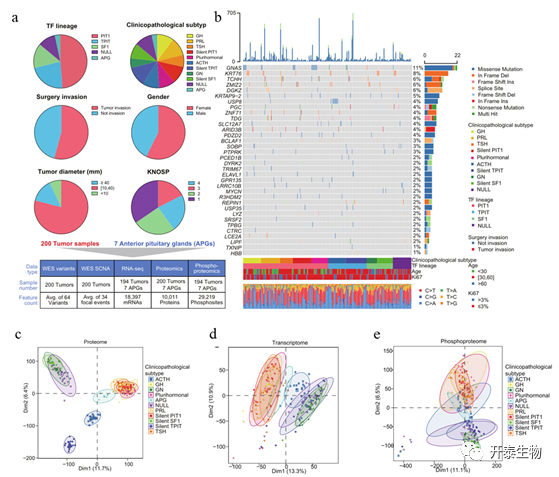 作者首先对收集患者组织和对照的垂体前叶临床病理特征,包括TF谱系、临床病理亚型、手术侵袭状态、患者性别、肿瘤直径和KNOSP分级进行了总结(图2a)。全外显子测序(WES)数据分析揭示了7333个突变基因,包括11092个非沉默点突变和419个插入或缺失(图2b)。随后作者又分别对蛋白组学、转录组学和磷酸蛋白组学的数据进行了主成分分析(PCA),结果表明PIT1谱系之间(GH、PRL、TSH、silent PIT1和多激素亚型)以及垂体前叶(APG)、ACTH、silent TPIT与其他类型的PitNET之间在蛋白质组学水平上的显著不同(图2c),而PIT1谱系在转录组学和磷酸蛋白质组学水平上显示出与APG组更高的相似性(图2d,e)。因此,这些结果提供了一个多组学景观,以提高对PitNETs分子机制的理解。