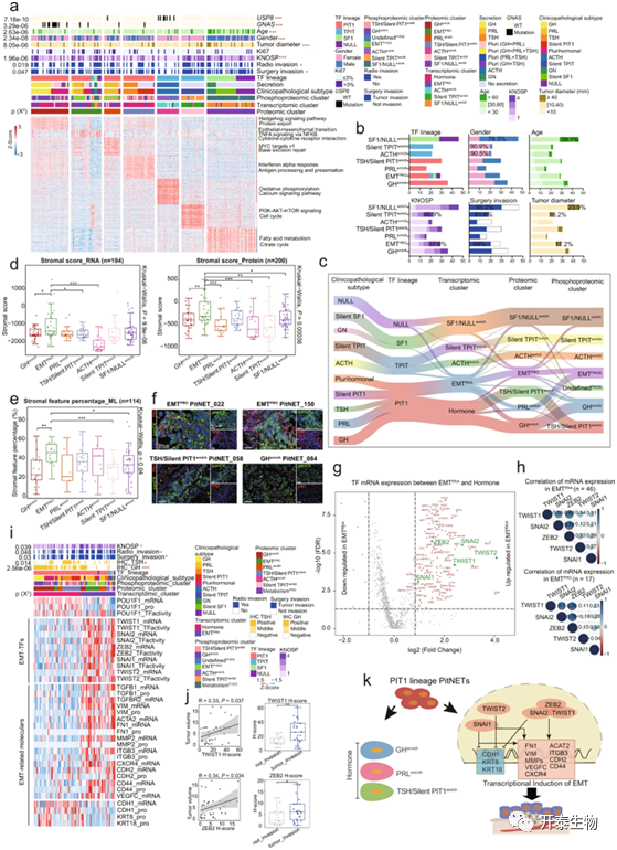 EMT诱导转录因子(EMT-TFs)被证实为EMT表型的关键驱动因素。作者比较了PIT1谱系中两个转录组亚群(EMTRNA and Hormone)之间的TF mRNA表达水平(图4g),证实了五个EMT-TFs在EMTRNA中显著上调,包括:SNAI1、SNAI2、ZEB2、TWIST1和TWIST2。此外,五种EMT-TFs mRNA的表达在EMTRNA和EMTPRO亚群中均显著正相关(图4h),与Hormone亚群相比,EMTRNA亚群中五种EMT-TFs的转录活性水平更高(图4i)。同样,EMT相关分子包括CDH2、VIM、CD44、FN1和ITGB1在EMTRNA亚群中上调,而CDH1、KRT8和KRT18则在转录组学和蛋白质组学数据集中下调(图4i)。另外,TWIST1和ZEB2的表达与其相应的肿瘤体积和侵袭性之间存在显著的正相关(图4j)。总之,PitNETs的整合蛋白基因组特征鉴定了一个之前未识别的、由EMT定义的高度侵袭性亚群(图4k)。