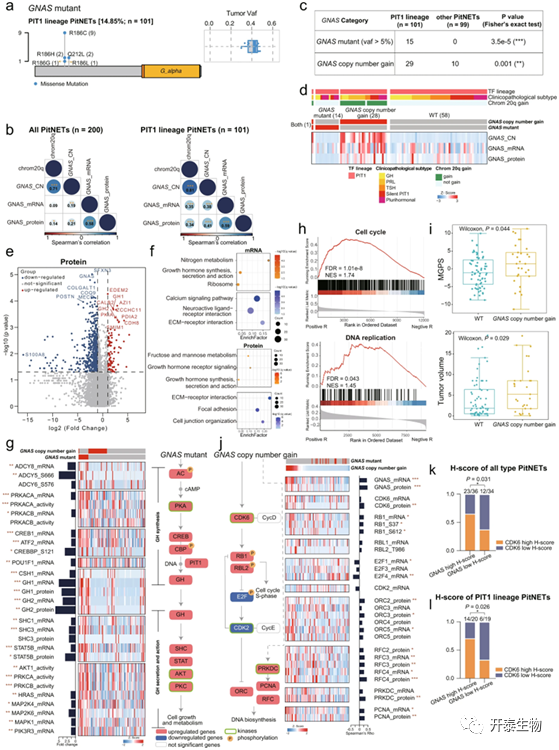 富含PIT1谱系的GNAS是最常见的突变基因,包含两个突变热点,R186C/G/L/H和Q212L(图3a)。GNAS拷贝数增加,对PIT1谱系具有特别强的影响(Spearman相关性)(图3b)。具有GNAS突变或GNAS拷贝数增加在PIT1谱系中显著富集(图3c)。因此,进一步将PIT1谱系分为三个亚组,包括野生型(WT)、GNAS拷贝数增加和GNAS突变体。与WT组相比,携带GNAS突变的样本显示GNAS蛋白水平降低,而GNAS拷贝数增加的患者在mRNA和蛋白质水平上显示GNAS增加(图3d)。进一步,作者比较了GNAS突变体和WT患者的差异表达蛋白,发现参与生长激素(GH)合成、分泌和作用途径(如GH1和GH2)的基因在mRNA、蛋白质和磷酸化水平上调(图3e,f)。另外,GSEA结果显示增殖相关的通路(比如细胞周期和DNA复制)在GNAS拷贝数增加的患者上调(图3h)。此外,与WT组相比,GNAS拷贝数增加组具有更高的多基因增殖评分和临床肿瘤体积(图3i)。在细胞周期相关分子中,PRKDC和CDK6是与GNAS拷贝数正相关的前两个蛋白质(图3j)。为了进一步确认GNAS拷贝数增加的影响,又进行了GNAS和CDK6的免疫组化(IHC)染色并计算得分。在PIT1谱系PitNETs和所有PitNETs中,GNAS得分高组中CDK6得分高的比例大于GNAS得分低组(图3k,l)。总之,这些结果说明了GNAS基因突变可能会导致激素分泌过多的不良事件。此外,GNAS拷贝数增加可以显著增强肿瘤细胞的增殖,靶向CDK6的抑制剂治疗可能对携带GNAS拷贝数目增加的PIT1谱系患者有效。