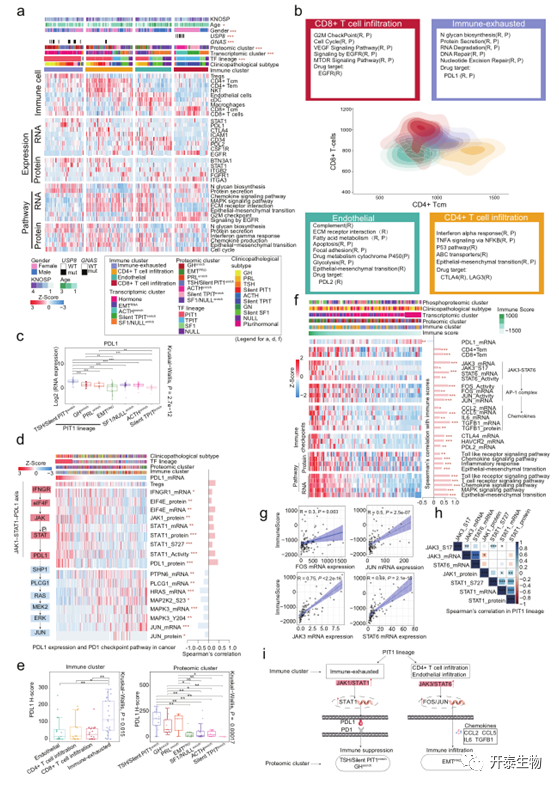 接下来,作者对转录组学数据使用xCell47分析推断肿瘤微环境中不同细胞类型的比例,聚类确定了具有不同免疫和基质特征的四组肿瘤:免疫耗竭、CD4+T细胞浸润、内皮细胞和CD8+T细胞浸润(图5a)。CD8+T细胞浸润簇包含ACTHenrich和silent TPIT亚群富集,其特征在于存在多种免疫细胞类型,包括中央记忆CD8+T和CD8+T(图5a)。在CD4+T细胞浸润亚群中,免疫抑制介质CTLA4上调,提示这些肿瘤可能对免疫检查点相关的治疗有反应(图5a,b)。免疫耗竭亚群由TSH/silent PIT1enrich和GHenrich蛋白质组亚群(主要是PIT1谱系)组成,其特征在于Treg细胞的较高分数和PDL1的上调(图5a,5c)。鉴于其在免疫抑制中的作用,作者进一步探讨了PDL1 mRNA表达与JAK1-STAT1-PDL1相关分子之间的相关性,包括PitNETs中的IFNGR1、EIF4E、JAK1和STAT1(图5d)。正如预期的,这些分子在mRNA、蛋白质和磷蛋白水平上显著正相关。此外, TCR信号相关基因,包括PTPN6、PLCG1和JUN,与PDL1 mRNA表达显著负相关(图5d)。在TSH/ silent PIT1enrich和GHenrich亚群(蛋白质组亚型)和免疫耗竭亚群(免疫亚型)中,PDL1表达显著较高,这与从多组学数据获得的结果一致(图5e)。有趣的是,另一个JAK-STAT轴JAK3-STAT6-FOS/JUN的表达与免疫评分高度相关(图5f)。据报道,STAT6可调节FOS和JUN,FOS和JUN可进一步调节下游趋化因子,如CCL2、CCL5、IL6和TGFB1,53,所有这些都在mRNA和蛋白质水平上与免疫评分显著正相关(图5f,g)。这些发现提示,EMTPRO亚群中趋化因子表达导致的免疫浸润增加可能受到JAK3-STAT6-FOS/JUN轴的调节。在多组学数据中,JAK1/STAT1在PIT1谱系肿瘤和所有Pitnet中均与JAK3/STAT6呈中度负相关(图5h)。