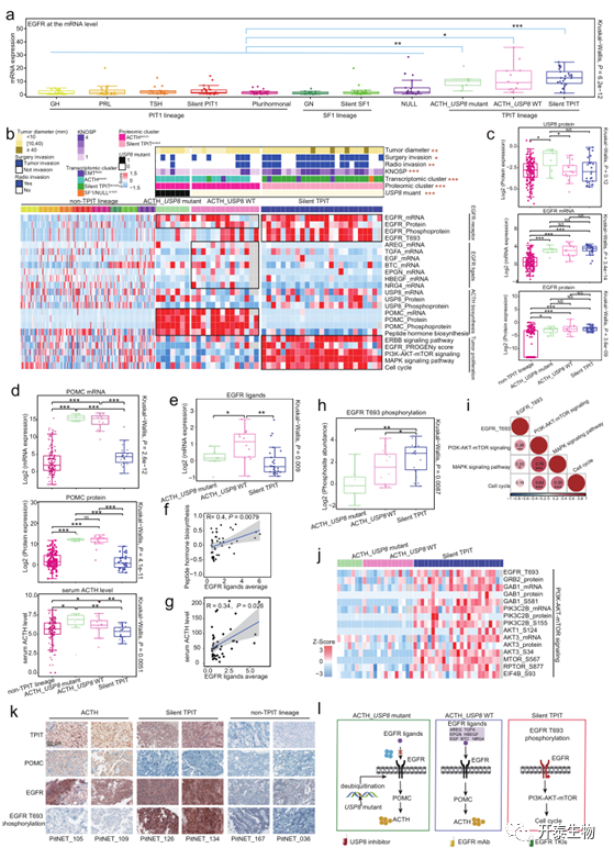 EGFR与多种人类癌症相关,包括头颈部鳞状细胞癌和肺腺癌,已被提议作为ACTH PitNETs的治疗靶点。作者发现TPIT谱系中EGFR mRNA表达、蛋白质丰度和磷酸化修饰的水平高于其他肿瘤(图6a–c),随后对EGFR相关途径的分析确定了三组显示EGFR激活的不同机制,包括具有USP8突变的ACTH肿瘤(ACTH_USP8突变体)、没有USP8变异的ACTH瘤(ACTH_ USP8 WT)和沉默的TPIT肿瘤(图6b)。在ACTH_USP8突变体组中,USP8功能获得突变将EGFR从泛素化中拯救出来,导致EGFR活性增强,并进一步促进POMC生物合成(图6c,d)。在ACTH_ USP8 WT组中,EGFR配体(即AREG、TGFA、EGF、BTC、EPGN、HBEGF和NRG4)的平均mRNA表达显著高于其他组(图6e),与肽激素生物合成和血清ACTH水平呈正相关(图6f,g)。在silent TPIT肿瘤中,EGFR T693磷酸化、EGFR下游途径或成分(包括PI3K AKT mTOR、MAPK)和细胞周期途径表现出显著的富集(图6h-j),表明EGFR T693磷酸化可能导致这些途径的激活。此外,EGFR的IHC染色显示其在TPIT谱系中的表达高于非TPIT谱系,与ACTH肿瘤相比,在silent TPIT肿瘤中发现EGFR T693磷酸化的阳性染色率更高(图6k)。基于这些结果,作者总结了三种模式中每种模式的潜在治疗选择(图6l)。