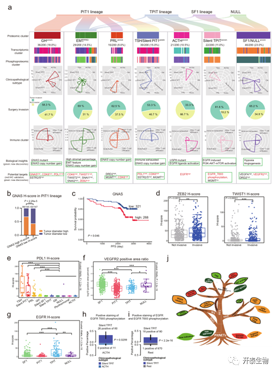 总之,在初始200个PitNET队列中确定的预后标志物和治疗靶点GNAS、ZEB2、TWIST1、PDL1、EGFR和EGFR T693磷酸化在750个PitNET队列的相应亚型中得到了验证。这些发现总结在PitNET树中,该树显示了一种更新的分子分类,其中患者被明确地分为七个亚群,用于潜在的治疗选择(图7j)。