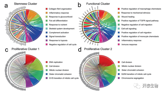 为了研究这些鉴定的亚群的可能功能,进行了GO和KEGG分析(图2)。对于生物过程类别,干性亚群的标记基因在炎症反应、脂肪细胞分化、骨骼系统发育和细胞周期的负调控中富集,表明这些亚群具有干性维持和多能性分化的特征(图2a)。对于功能亚群,其标记基因主要在炎症和免疫反应中富集(图2b)。此外,有丝分裂细胞周期的G1/S转换在增殖亚群1的生物过程类别中富集,而有丝分裂细胞周期的G2/M转换在增殖亚群2的生物过程类别中富集,这表明这两个增殖簇在细胞周期中的不同阶段(图2c-d)。