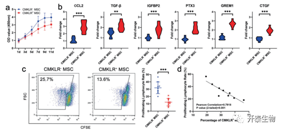 通过流式细胞术将MSCs分为CMKLR1+ MSC功能亚群和CMKLR1- MSC亚群,包括干细胞和增殖亚群,以进一步研究它们的潜力。结果表明,CMKLR1+ MSC 功能亚群的增殖率低于含有其他 MSC 的群体(图 4a)。与 scRNA 测序结果一致,免疫相关细胞因子,包括 CCL2、TGF-β、IGFBP2 和 PTX3,在 CMKLR1+ MSC 功能亚群中高度表达。此外,成骨和脂肪生成相关因子(如 GREM1 和 CTGF)的表达在 CMKLR1+ MSC 功能亚群中上调(图 4b)。此外,与抑制 PBMC 增殖相关的 CMKLR1+ MSC 功能亚群的免疫调节潜力强于 CMKLR1- MSC 亚群(图 4c)。MSC免疫调节潜力与样品中 CMKLR1+ MSC 的百分比呈正相关(图 4d)。
