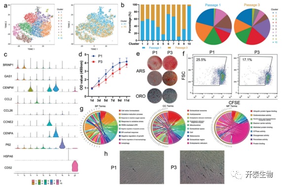 有趣的是,第 3 代 MSCs 的成骨分化能力强于第 1 代的 MSCs,但成脂分化试验显示相反结果(图6e)。此外,通过CFSE测定显示的免疫调节潜力在第3代的MSCs中也更强(图6f)。对簇8的标记基因的GO分析显示,该MSC亚群与细胞氧化还原稳态、内质网应激、自噬和生长的负调节有关,表明该簇可能是一个衰老亚群(图6g)。此外,与第1代相比,在第3代的MSCs中观察到更多的衰老细胞(图6h)。