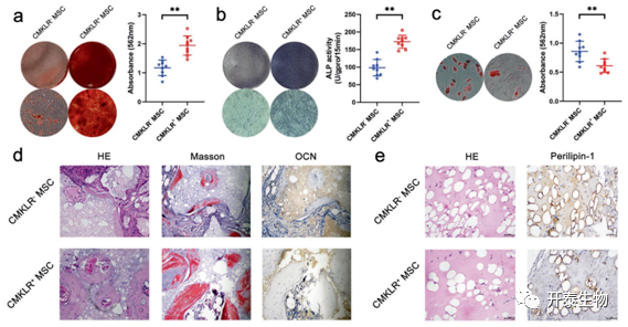 进一步研究CMKLR1+ MSC 功能亚群的成骨和成脂分化潜能。ARS 染色结果显示 CMKLR1+ MSCs 的矿化水平较高,表明 CMKLR1+ MSCs 具有更强的成骨分化潜能(图 5a)。ALP 染色和定量测定显示一致的结果(图 5b)。相比之下,ORO 染色显示 CMKLR1+ MSCs 中的脂滴比 CMKLR1- MSCs 中的脂滴少,表明进行脂肪形成分化的能力较弱(图 5c)。使用体内模型评估 CMKLR1+ MSCs 的成骨和成脂分化能力。Masson 染色和 H&E 染色均显示CMKLR1+ MSC 组的新骨形成量远大于 CMKLR1- MSC 组,这也通过组织中 OCN+成骨细胞的数量得到证实(图 5d)。如H&E染色所示,CMKLR1+ MSC组的体内脂肪细胞形成较低。此外,CMKLR1+ MSC 组的 Perilipin-1+ 脂肪细胞也较少(图 5e)。