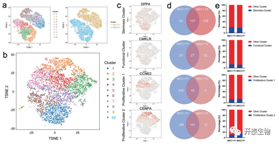 比较相同传代的两个不同MSC样品(MSC1 P1和MSC2 P1)的scRNA测序数据时,AGGR分析表明两个MSC样品完全分离成两个独立的没有连接的亚群(图7a)。对MSC2 P1的进一步亚群分析显示,鉴定出10个簇,与MSC1 P1的簇数匹配(图7b)。作者鉴定了由DPP4标记的干性亚群、由CMKLR标记的功能性亚群以及由CCNE2和CENPA标记的增殖性亚群1和2(图7c)。尽管MSC2 P1中亚群的标记基因与MSC1 P1中的标记基因并不完全相同,但大多数基因在MSC1 P1和MSC2 P1之间的同一亚群中一致表达(图7d)。此外,在MSC1 P1和MSC2 P1之间,每个亚群的百分比几乎相等(图7e)。