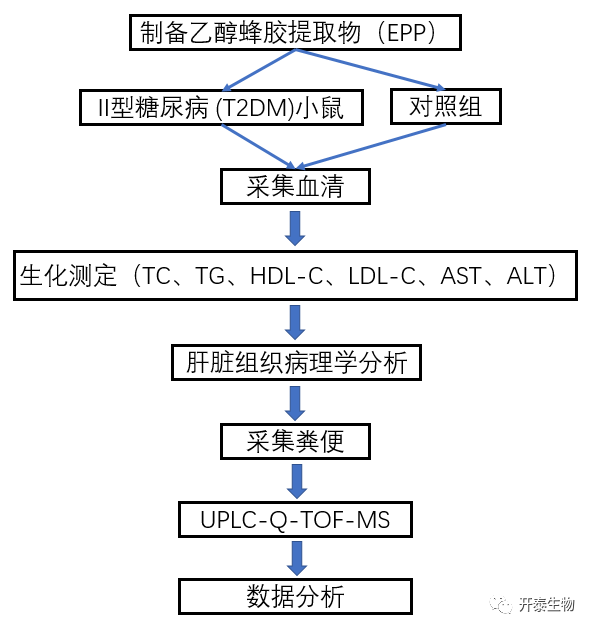 II型糖尿病(T2DM)是一种异质性疾病,主要特征为胰岛素抵抗。数据显示,目前全球共有约5亿人患有糖尿病。越来越多的研究表明,肝脏疾病和肠道菌群可能与肥胖、胰岛素抵抗和T2DM等代谢性疾病密切相关。研究表明,蜂胶具有抗菌、抗炎和免疫调节作用,可以有效预防糖尿病,但关于蜂胶乙醇提取物(EEP)在治疗T2DM过程中对粪便代谢组学的影响还不清楚。本研究采用超高效液相色谱-四极杆飞行时间质谱(UPLC-Q-TOF-MS)分析T2DM小鼠和正常小鼠的粪便代谢组差异,以筛选T2DM潜在的生物标志物,探讨EEP在T2DM发病机制中的作用,为EEP的临床应用提供新的思路。