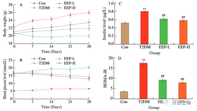 为了探究EPP对胰岛素抵抗的治疗效果,作者检测了EPP治疗28天后小鼠空腹胰岛素(FINS) 水平和胰岛素抵抗指数(HOMA-IR)。结果表明,EPP治疗前,T2DM组的FINS水平显著高于对照组,表明T2DM出现胰岛素抵抗。而与T2DM组相比,EEP-L和EEP-H组的FINS水平显著降低,EEP-H组的效果更好(图1C)。同时,HOMA-IR结果显示,与T2DM组相比,EEP-L和EEP-H组的HOMA-IR指数也显著降低 (图1D),这表明EEP可以增强胰岛素敏感性并降低胰岛素抵抗水平。