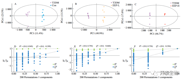 主成分分析(PCA)显示了各组代谢物总体差异。与T2DM组小鼠相比,在EPP治疗后,小鼠粪便代谢组出现明显差异(图4A-C)。进一步使用OPLS-DA模型来更好的区分组间的代谢物,从得分图来看,对照组和T2DM小鼠之间分离程度大,表明T2DM小鼠建模成功(图5A)。此外,EPP-L、EPP-H组与T2DM小鼠之间的差异也很大,表明EPP对T2DM小鼠粪便代谢组产生影响(图5B,C)。同时,为了防止模型的过度拟合,作者使用了七重交叉验证和200个响应排列测试 (RPT) 来评估模型的质量,结果如图5D-F所示:OPLS-DA分析显示Q2的回归线在纵坐标上的截距小于0,表明不存在过度拟合,数据可用于后续的代谢组学研究。
