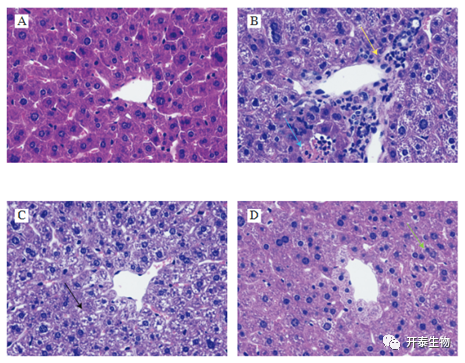 (3)EEP-L组肝小叶结构较清晰,仅部分肝细胞有轻度颗粒变性 (黑色箭头),未见明显炎性细胞浸润(图3C);